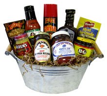 Basket includes Howard's Hot Pepper Relish, B&G Hamburger Relish, Hell on the Red Party Dip, Pam for the Grill, Gulden's Spicy Brown Mustard, French's Meat Marinade Seasoning Mix, Cajun King Char-Grill Seasoning Mix, Anchor Bar Original Buffalo Wing Sauce, and Cattlemen Smokehouse BBQ Sauce. Basket is wrapped in cellophane and tied with bow and ribbon. Basket size is approx. 15"h by 15"l.